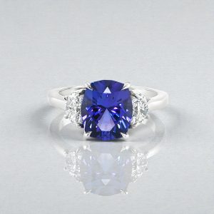 An exceptional 4.37ct cushion-cut Tanzanite sits at the heart of this striking design, celebrated for its deep, vivid violet-blue hue. Framed by two half-moon diamonds totalling 0.66cts, each graded F Colour with VVS/VS Clarity, the ring offers perfect balance and brilliance.