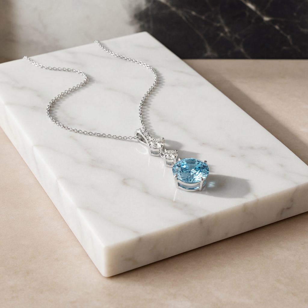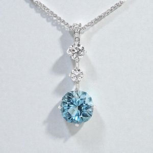 This exceptional pendant features a vivid blue, round-cut Nigerian Aquamarine weighing 3.29cts, exquisitely crafted and set in an Art Deco–inspired design. The Aquamarine is suspended vertically from an 18-inch platinum Spiga chain, creating an elegant, elongated silhouette.
