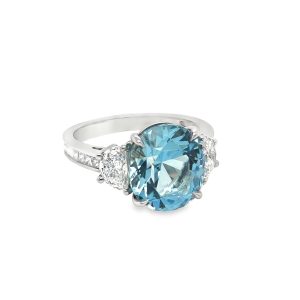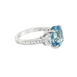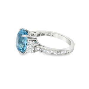 A captivating 4.37cts Mozambique aquamarine takes centre stage, its vivid blue hue radiating clarity and depth. On either side, a pair of half-moon diamonds totalling 0.75cts adds balanced brilliance to the design. Along the shoulders, channel-set princess-cut diamonds 0.42cts introduce a sleek, architectural touch.