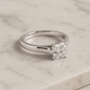 A single cushion cut diamond ring 1.01 cts. This stone is GIA certified colour E, clarity VS2.