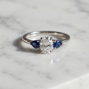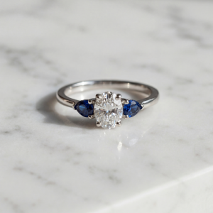 A platinum 3 stone ring with single centre oval cut diamonds 0.50cts. This GIA certified D colour, clarity SI1. Complimented with two blue sapphires 0.37cts on shoulders.