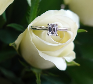 Single stone emerald cut diamond 0.47cts. Mounted in platinum, the stone is GIA certified and graded colour E, clarity SI1.