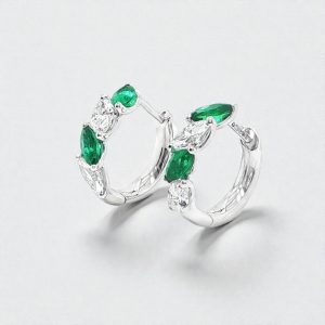 Infinito Collection – 18ct white gold huggy earrings, featuring 0.60 cts GSI marquise diamonds and 0.57 cts emeralds.