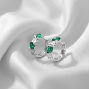Infinito Collection – 18ct white gold huggy earrings, featuring 0.60ct GSI marquise diamonds and 0.57 ct emeralds.