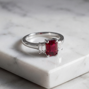 A platinum 3 stone ring with single emerald cut ruby 1.13cts. Complimented with two diamonds 0.44cts on shoulders.