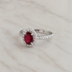 Single ruby oval cut ring 0.90cts set with a diamond halo and brilliant cut diamonds shoulders 0.37cts total, mounted in all platinum.