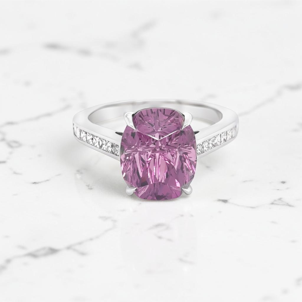 An impressive Mahenge Garnet 5.37cts cut by renowned artisan stone cutter Desmond Chan, into a stunning ring designed by us here in Nantwich. With princess cut diamond shoulders and a diamond under bezel of 0.47cts, mounted in all platinum with talon claws.