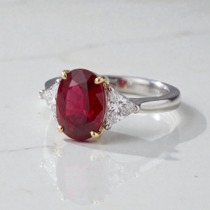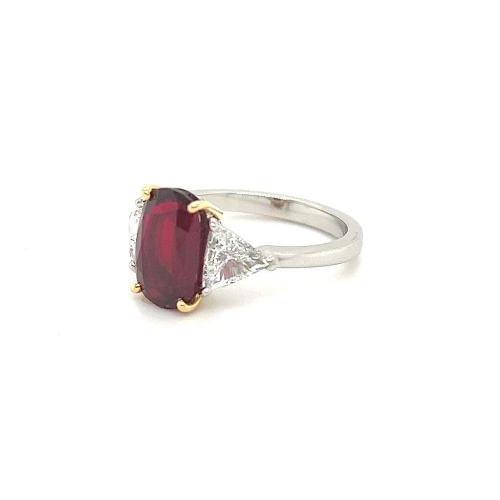 This magnificent ruby 3.04cts, cushion cut with two diamond trillion 0.88cts, in platinum with 18ct yellow gold claws set with diamond under bezel.