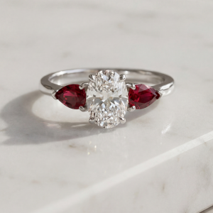 A platinum 3 stone ring with single centre oval cut diamond 0.50ct. This GIA certified D colour, clarity SI1. Complimented with two rubys 0.40ct on shoulders.