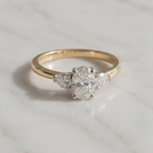 An elegant 3 stone diamond ring featuring a 0.70ct oval-cut centre diamond, GIA certified and graded E colour, SI1 clarity. Complemented by two pear-cut shoulder diamonds totalling 0.32ct, total carat weight 1.02ct.