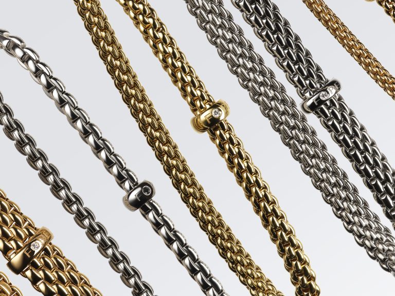 The whole Fope collection is made up of beautiful necklaces, bracelets, rings and earrings in yellow, white or rose 18ct gold either plain or set with Diamonds or coloured gems.