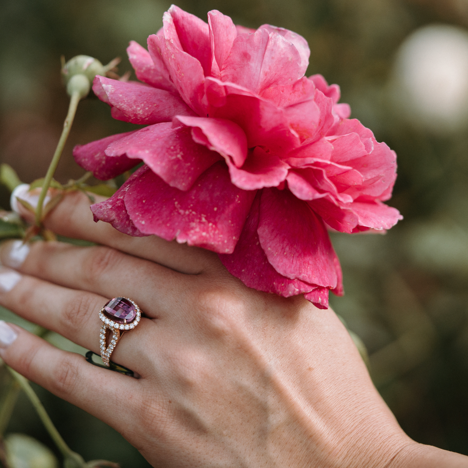 This stunning checkerboard Rhodolite Garnet 5.33cts, cut by the renowned artisan stone cutter Desmond Chan.